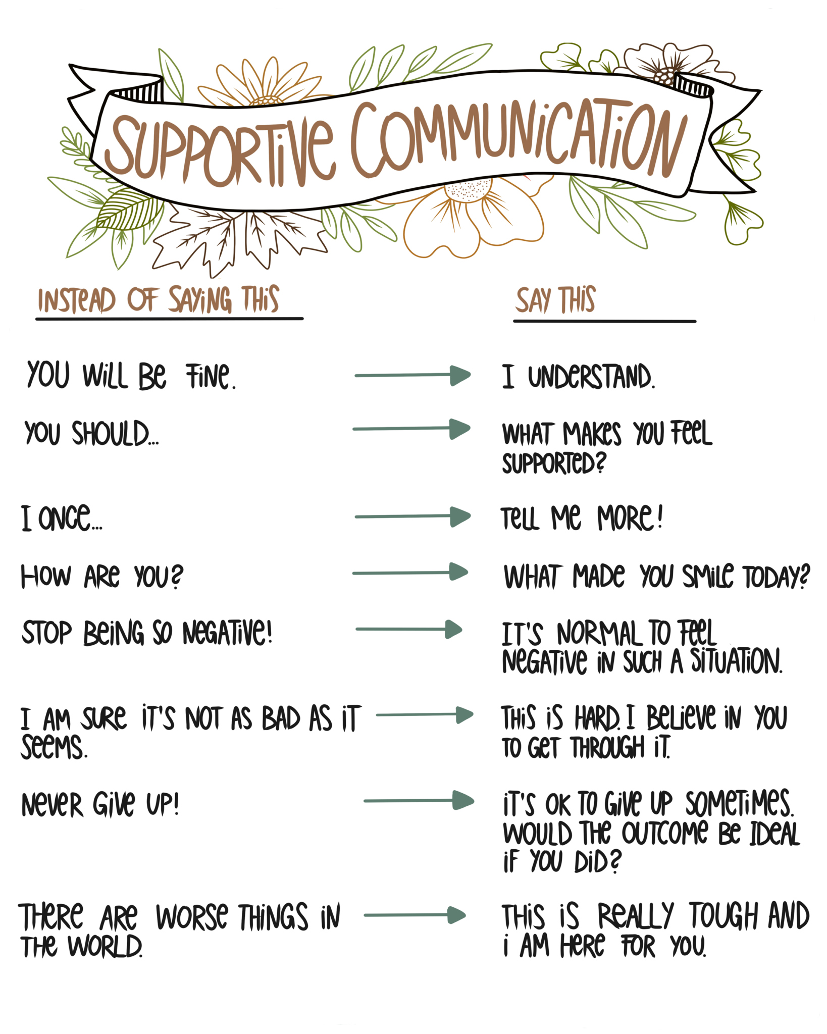 Supportive communication has an easy guiding principle: The feelings of a person should always be respected and never equalized. Every person has his or her truth, so act with kindness and the way you would like other people to treat you.