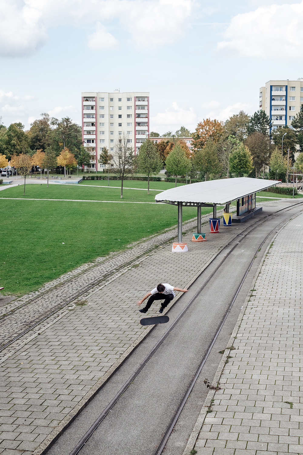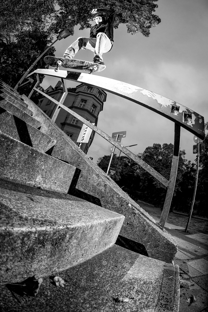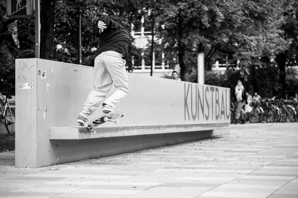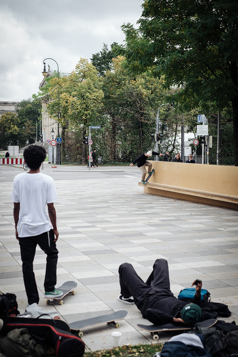 Skating the streets every day and night was and is something we love. You get kicked out of spots, have run-ins with the police and get into confrontations with “concerned” citizens. For this time in Munich, we‘ve been pretty lucky, although we were a crew of 15 people. There was only one bust, which was actually funny: The female security guard screamed so loud at us, that we had to laugh out even louder. “Feierabend!”