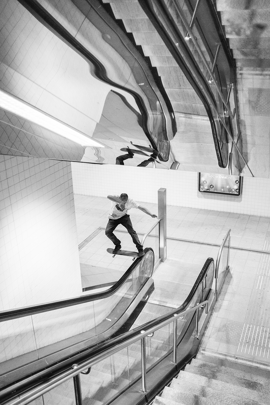 After sitting in the car for an hour and a half to Rotterdam, it turned out that Damiaan had forgotten his board, so the session started somewhat disappointing. The majority of the crew was already on their way home but after the hope was almost lost, we came across this spot in a metro stop. Paco (Damiaan) saw his chance and picked up some rad clips on Ziggy’s board, including this nosestall.
