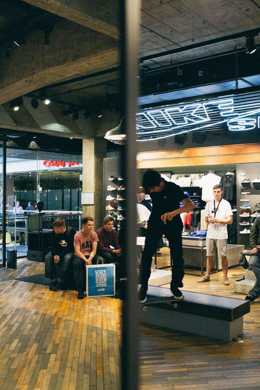 Yesterday Nike SB invited the winners of each Project DSS event plus the Nike SB team riders to an exclusive session at Nike Town Berlin. There they had the unique possibility to skate through the huge Nike shopping mall. After closing time, everyone could enjoy dinner while Jan Kliewer from Yamato Living Ramps revealed the outcome of the votings and the construction plans for the expansion of the Dog Shit Spot at Warschauer Straße. The final outcome of your votes and thus the plans for the park will be presented on Go Skateboarding Day next week. So make sure to join the upcoming Nike GSD event! For more information click here.