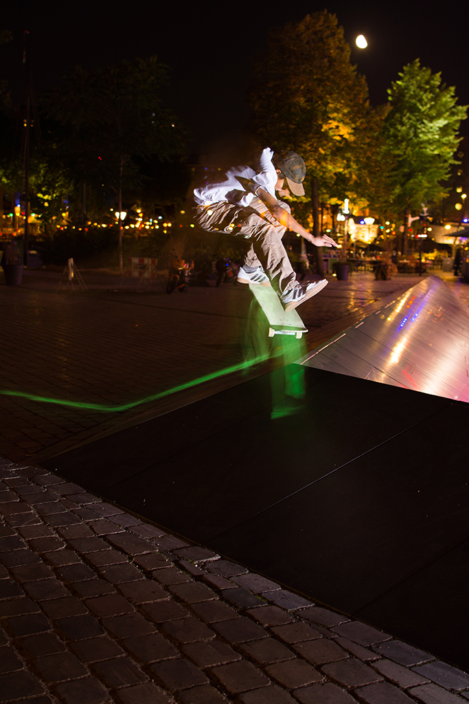 It was quite hard filming with that setup though, since you need to recharge the glow powder with light for it to light up at it’s maximum. We had to charge it up about every 3 tries or so, sometimes the spot was too bright and we had to recharge it every try for the board to actually shine.